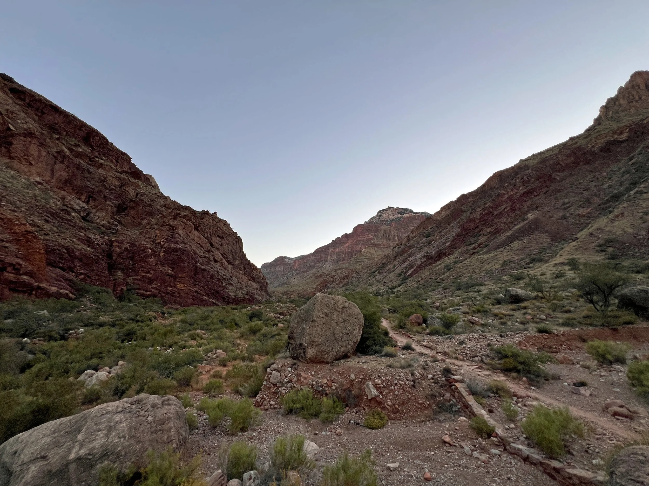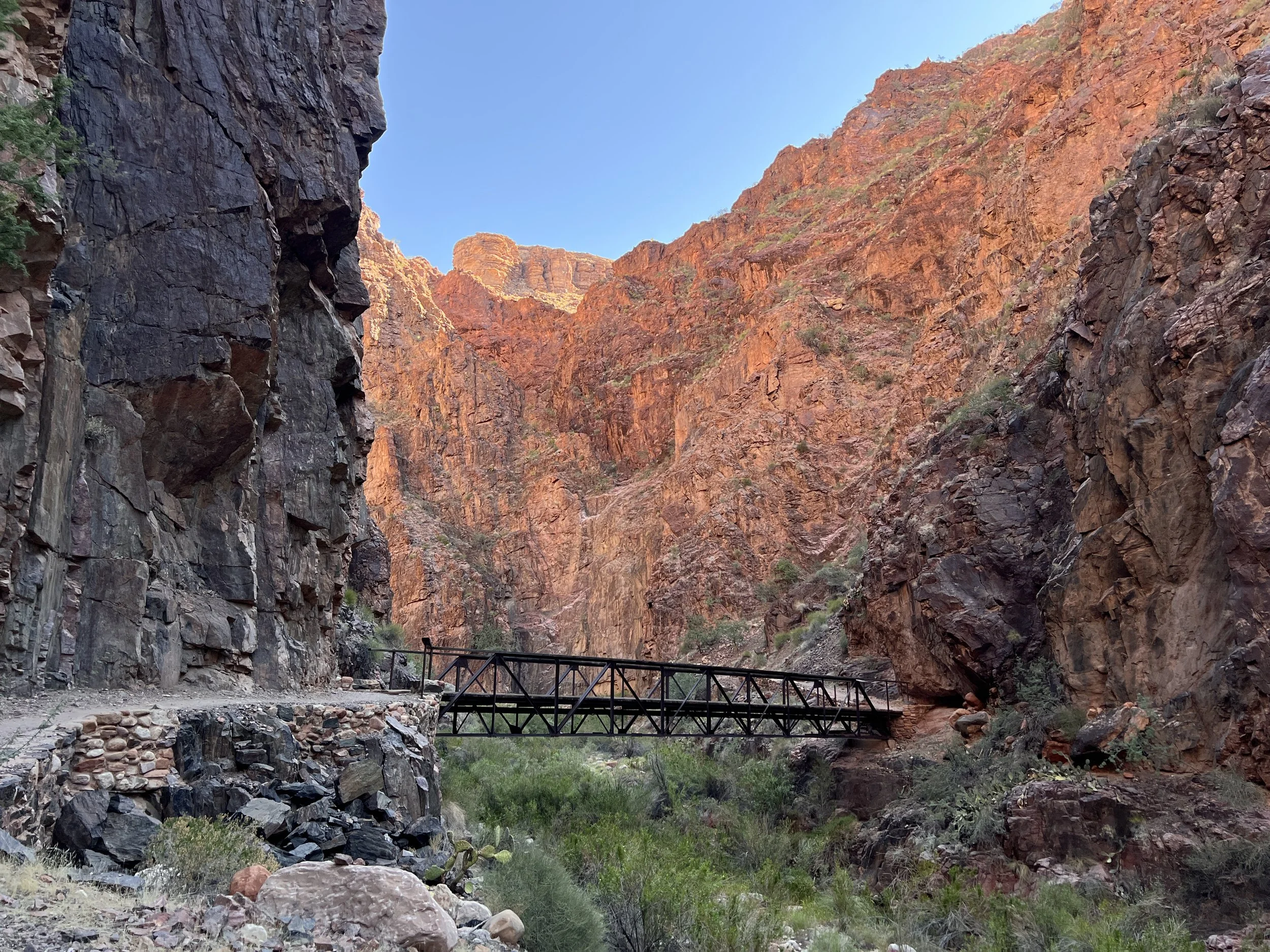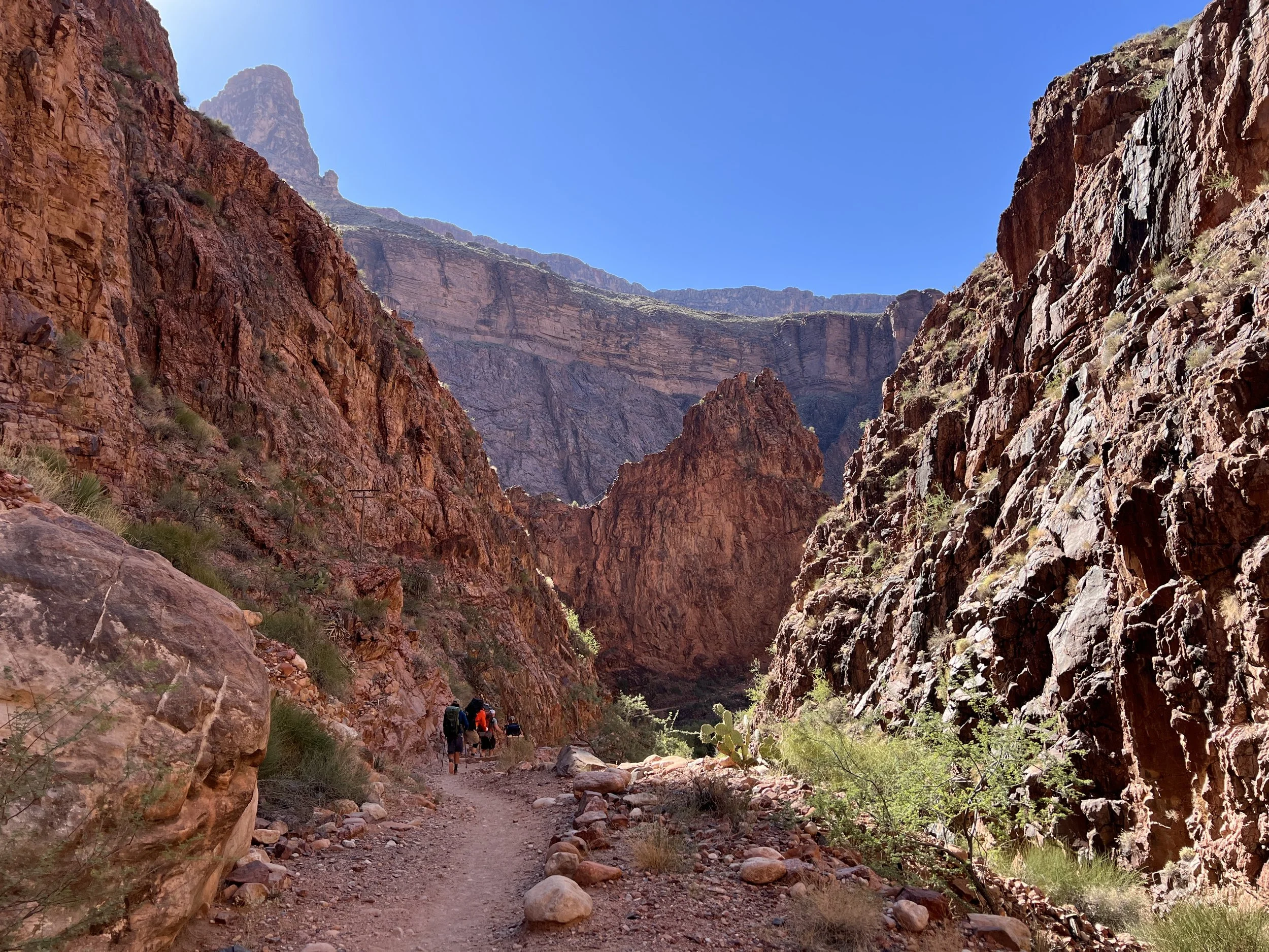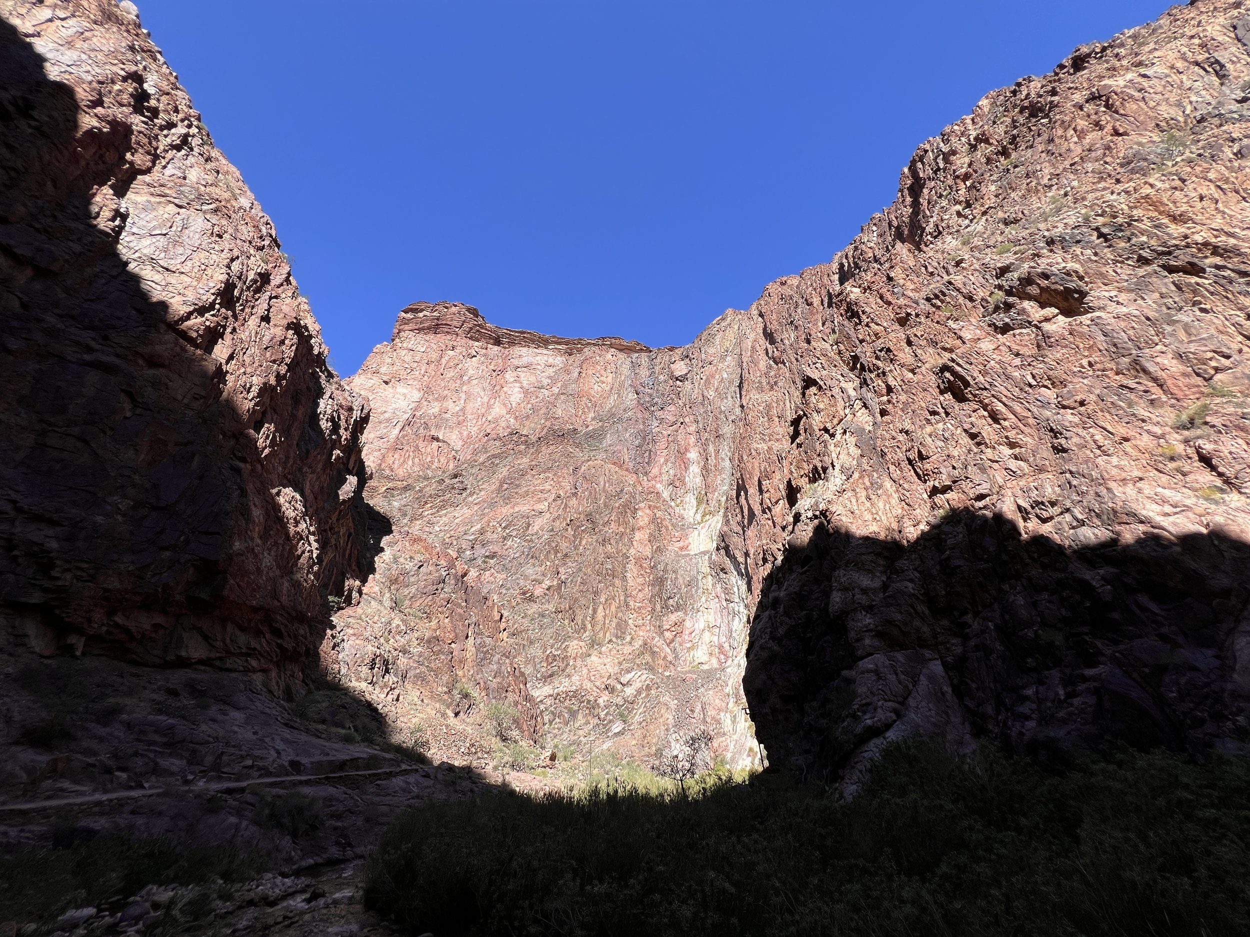 Our pre-dawn departure had another goal besides beating the general high temperatures. The North Kaibab trail ends in a section notoriously known as “The Box”. The Box is approximately three miles long and ends about a mile from Phantom Ranch. It is characterized by high black rock walls that absorb the sun’s energy throughout the day and radiate the absorbed energy down onto the trail. The temperatures in The Box can exceed 120° F! We scheduled our hike to pass through this section long before the heat got to that point.
