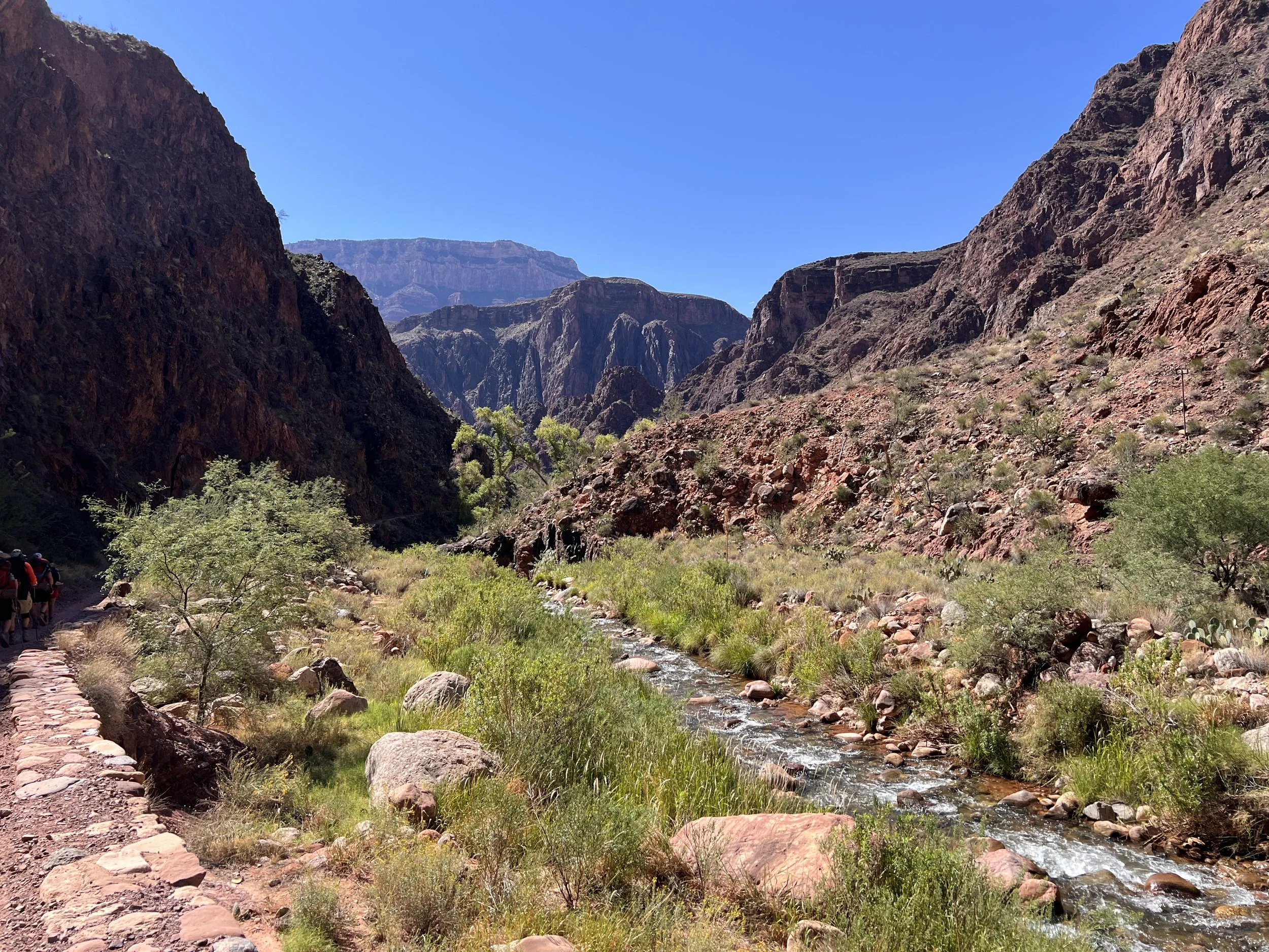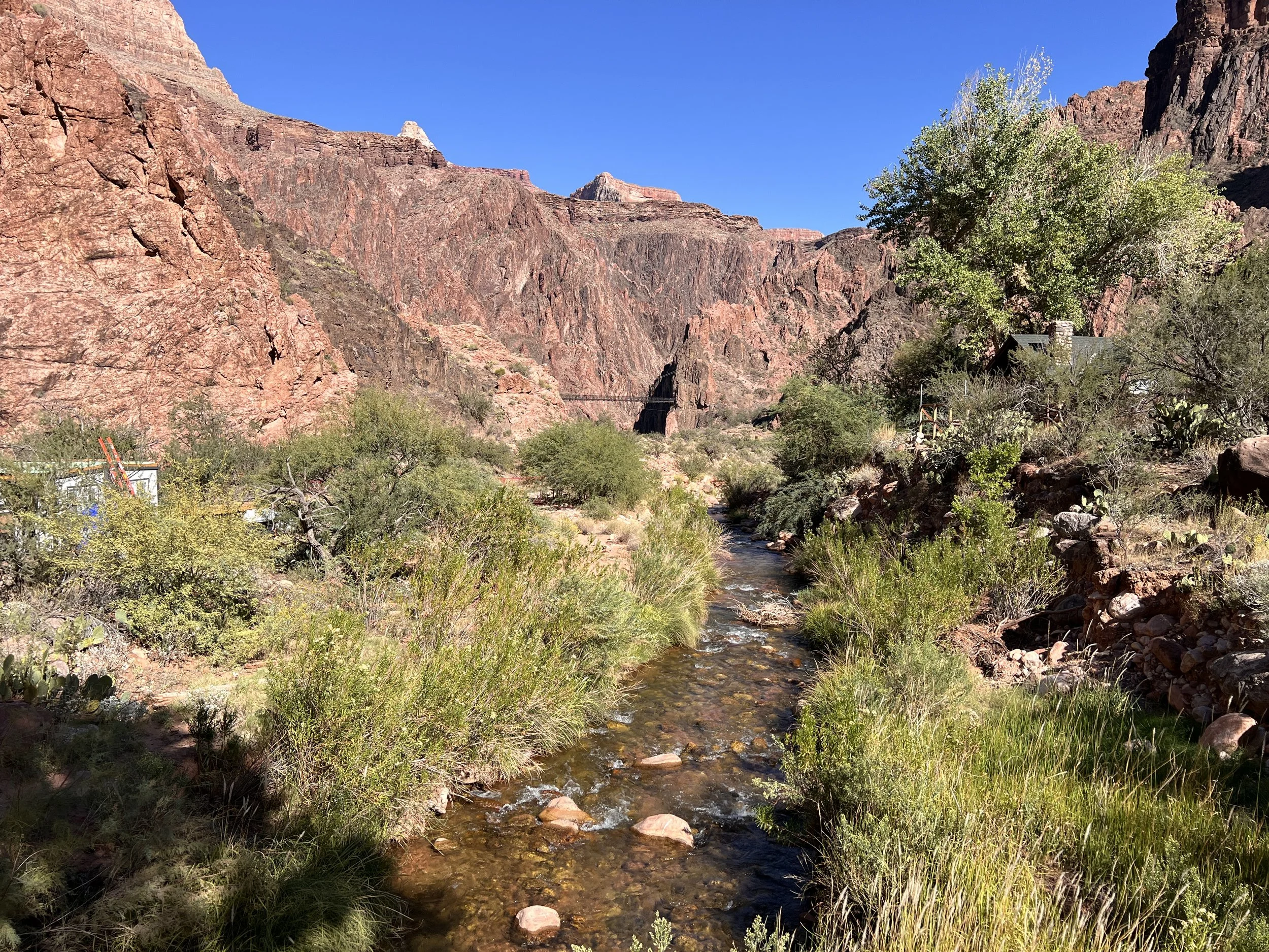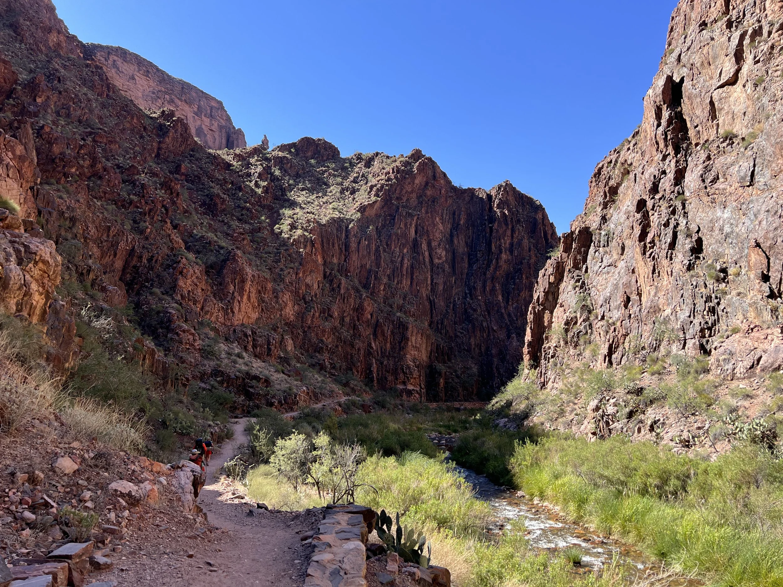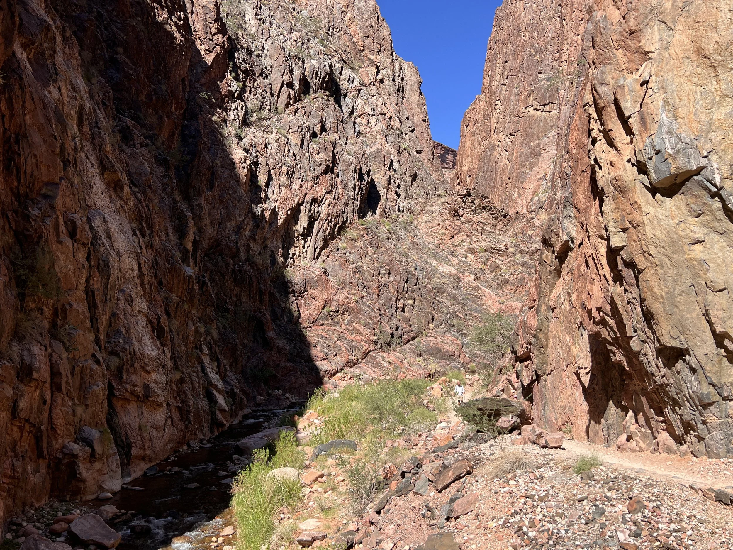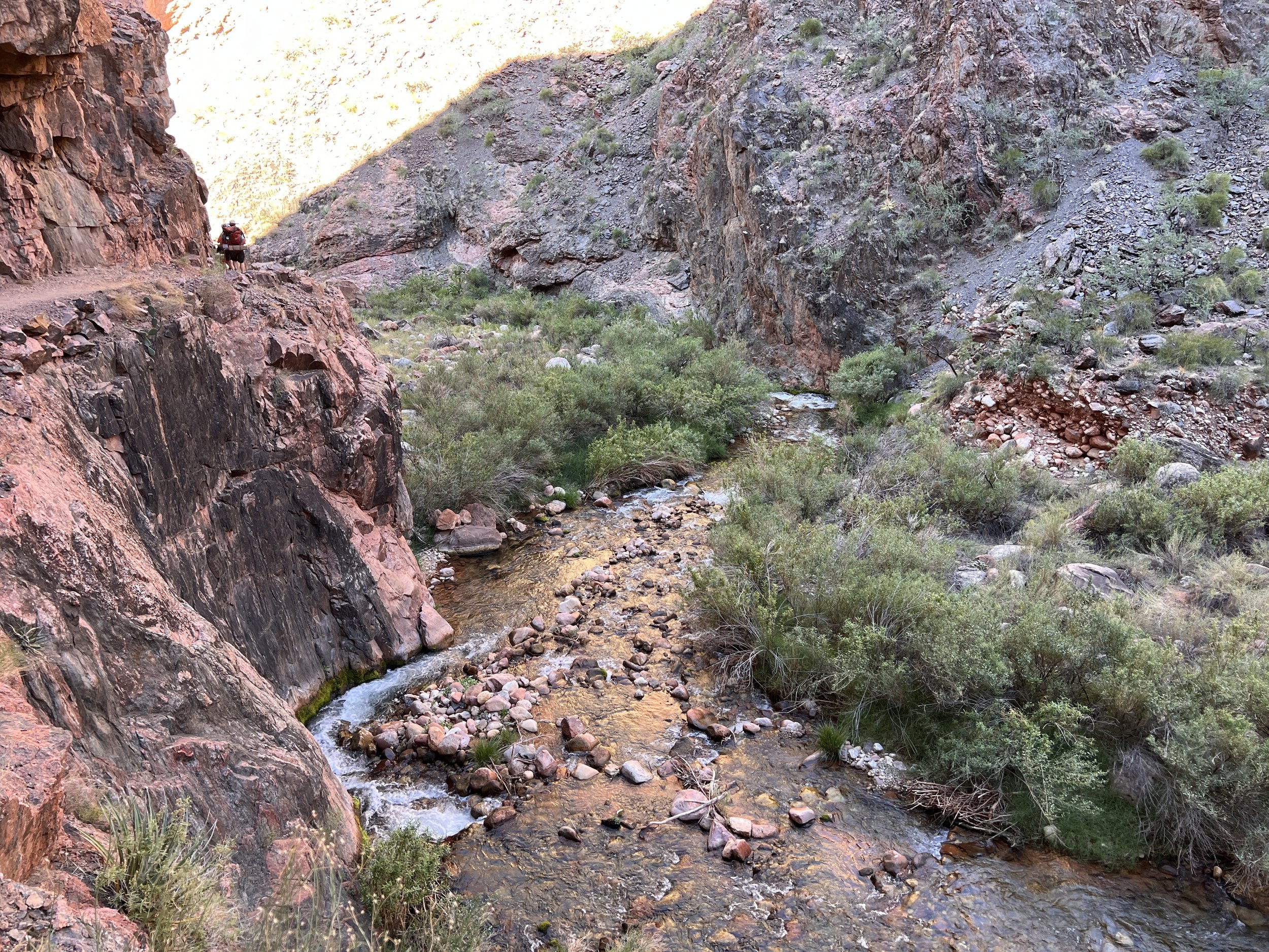 The canyon walls started to close in on us as we made our way down the trail from Ribbon Falls. Bright Angel Creek was now our constant companion as we made our way down the trail. I appreciated this as it allowed me opportunities to easily soak my hoodie. Even though it was relatively early, about 10:00 am, it was starting to get hot and the wet hoodie felt like the difference between the Sahara desert and Alaska! Temperatures were expected to exceed 100° F at our destination and I was committed that my hoodie would never dry out!