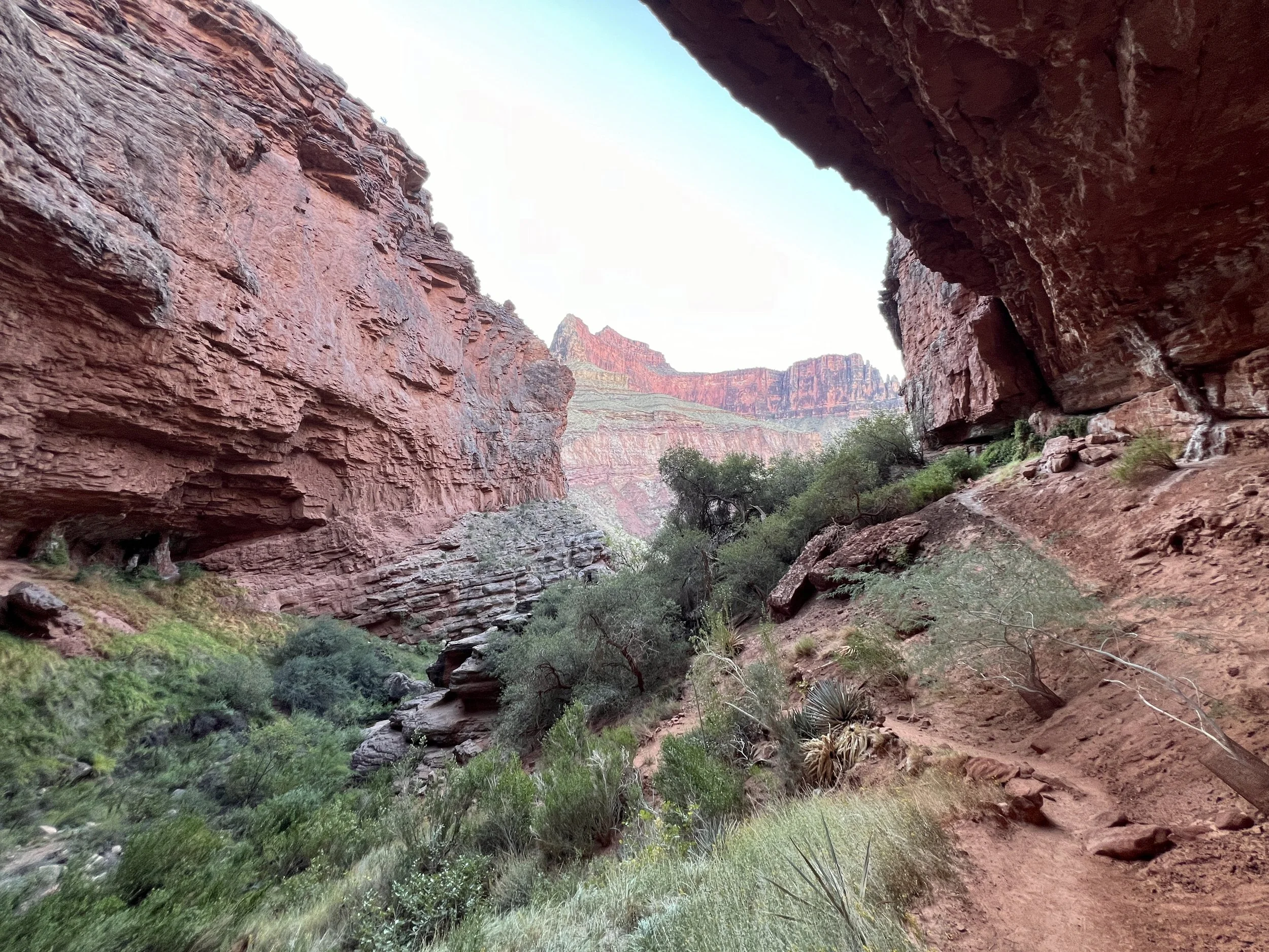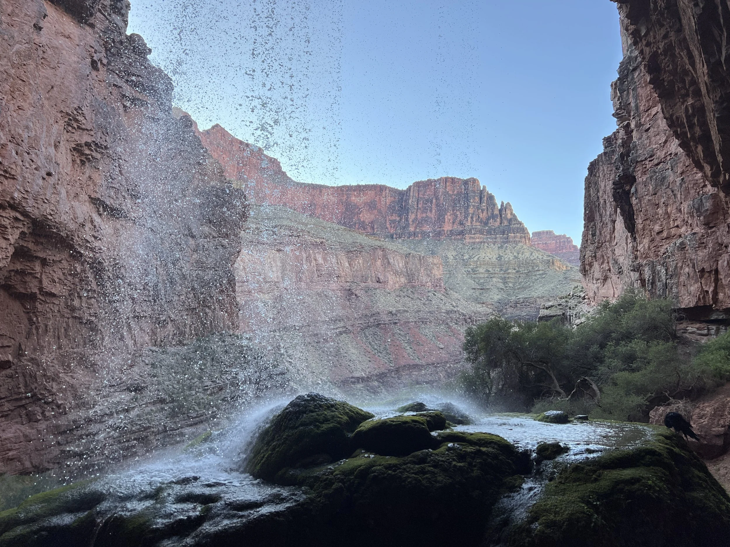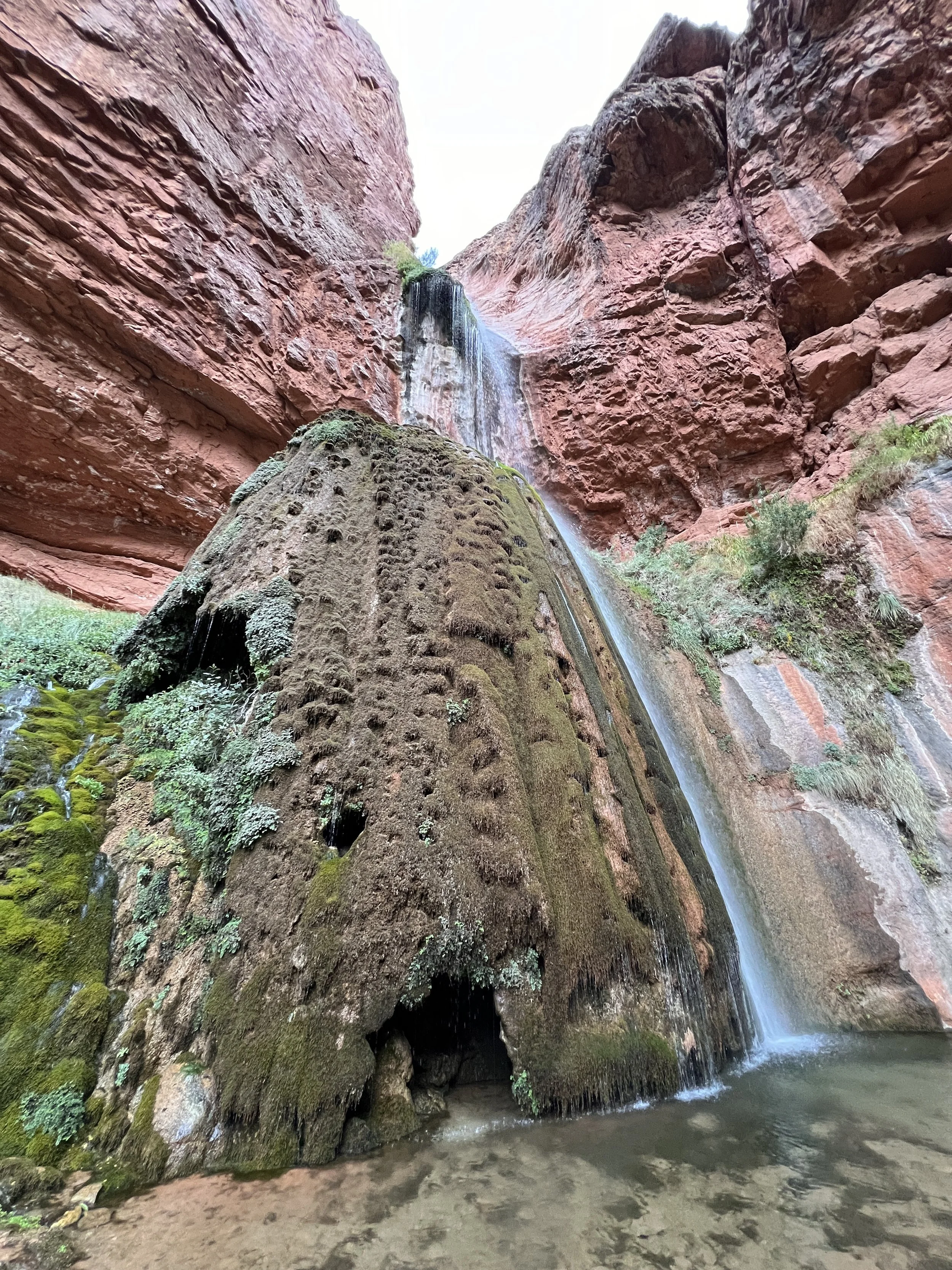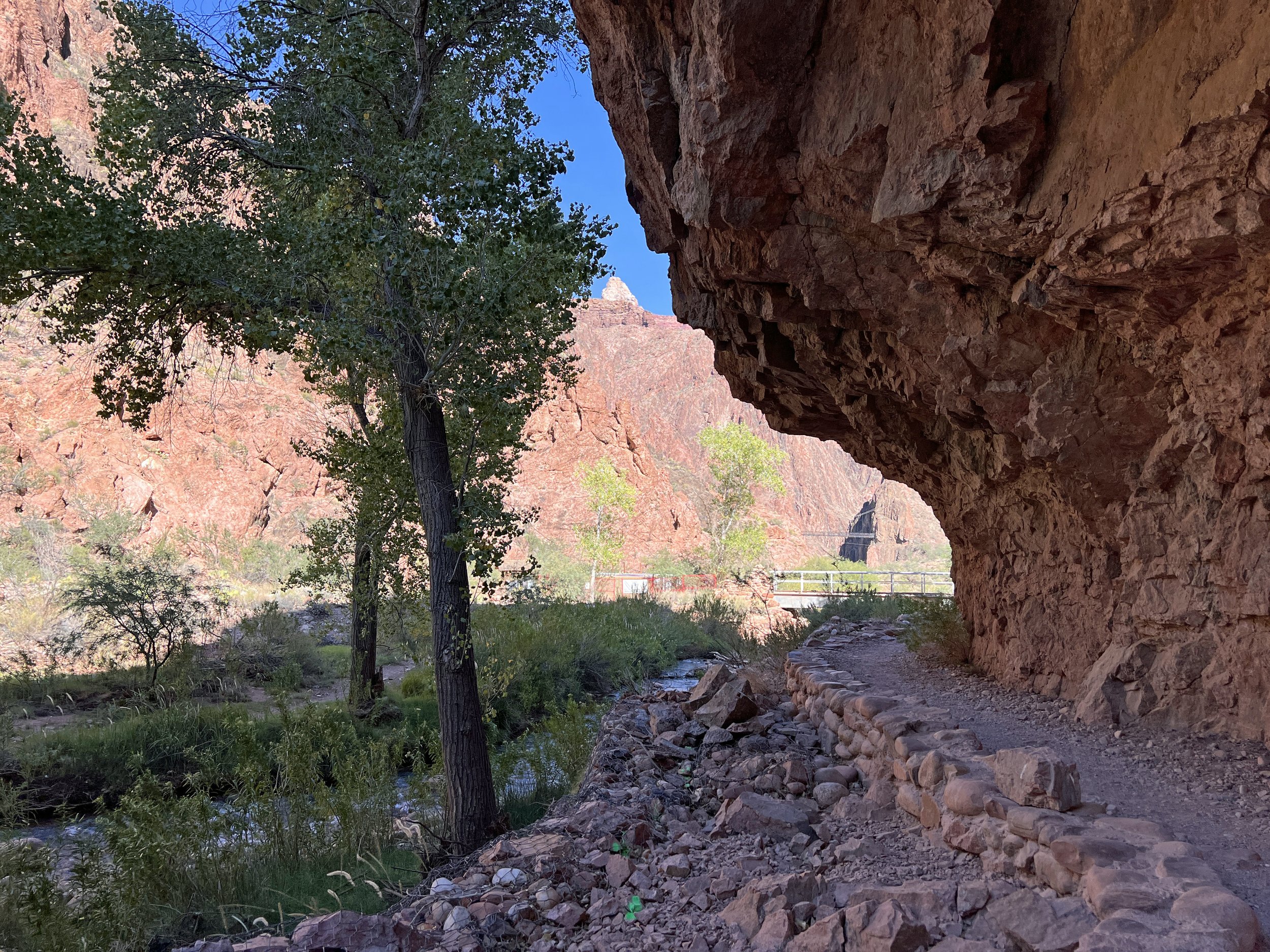 Our first side quest, Ribbon Falls, was an early adventure shortly after leaving Cottonwood Campground. I read that less than 1% of visitors to the Grand Canyon hike below the rim. The hike to Ribbon Falls is a specific destination and even fewer of the hikers who go below the rim make it to this unique spot. The trail to the falls is not clearly marked and we had to cross the creek several times back and forth to eventually reach the falls. We crossed hundreds of hikers on the main trail on Day 2 but only met four or five at the falls. That serenity served to make the history of the falls all the more impactful.